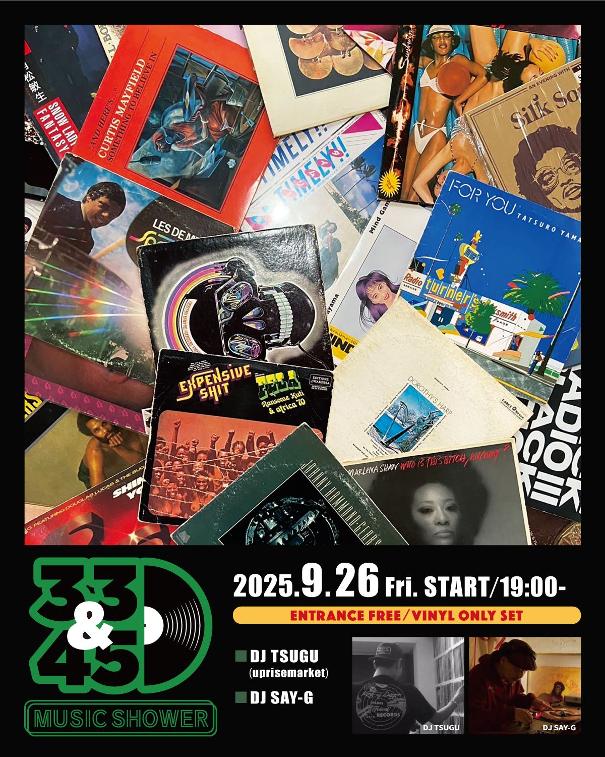 Brooklyn Parlor Osakaにて、DJイベント33&45 MUSIC SHOWERを開催! MEMBER: DJ TSUGU(uprisemarket) 30年を超えるDJ/レコードバイヤー歴を持ち、大阪市内でストリート・カルチャーに深く根差したファッション、音楽を発信するショップ「uprisemarket」を運営。これまでBiz Markie、De La Soul、Diamond D、Muroなど海外、国内の著名ヒップホップ・アーティストを招聘して幾多のイベントを主催するなど、関西の濃いクラバーたちからの熱い信頼を得ているシーンの生き字引的存在。 DJ SAY-G レコードにこだわり抜いたDJスタイル。HIPHOPを軸にJAZZ.SOUL.FUNK.またはREGGAE.BRAZIL等プレイ。自身でsound bomb recordsも経営するレコード愛好家。 INFORMATION: ・ご飲食代のみ頂戴します。 ・おひとり様につき1DRINK&1FOOD以上のご注文をお願いします。 ・ご予約はお電話またはグルメサイトにて承ります。